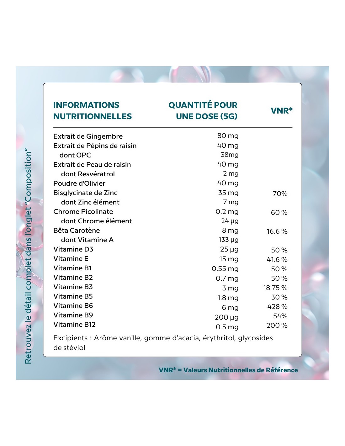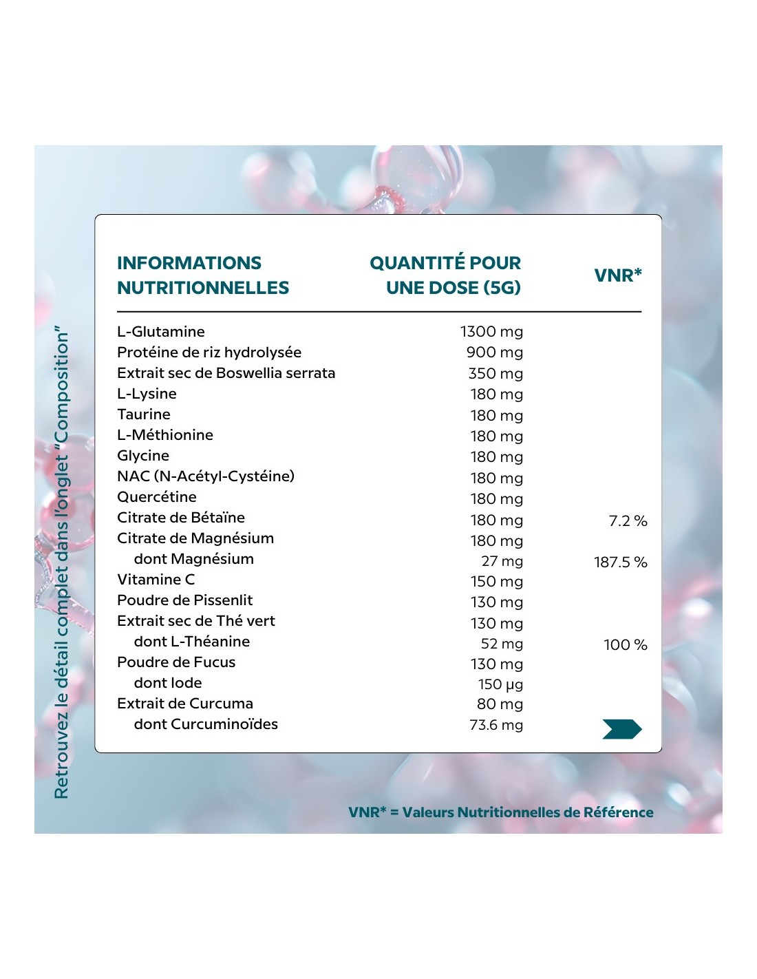 L-glutamine, hydrolyzed rice protein (oryza sativa), boswellia serrata extract, L-lysine hydrochloride, L-methionine taurine, glycine, N-acetyl-cysteine, quercetin, betaine citrate, magnesium citrate, L-ascorbic acid, dandelion powder (taraxacum officinalis), green tea leaf extract (camellia sinensis L. kuntze), bladderwrack powder including iodine, turmeric extract including curcuminoid, ginger extract (zingiber officinale roscoe), bulking agent: acacia gum, grape seed extract (Vitis vinifera L. ) including proanthocyanidin oligomers (OPC), grape skin extract (Vitis vinifera L.) including resveratrol, olive powder (Olea Europaea L. ), zinc bisglycinate, vanilla flavor, chromium picolinate including elemental chromium, beta carotene including vitamin A, vitamin D3 (cholecalciferol), vitamin E (D-alpha tocopheryl acetate), vitamin B1 (thiamine hydrochloride), vitamin B2 (riboflavin), vitamin B3 (nicotinamide), vitamin B5 (pantothenic acid), vitamin B6 (pyridoxal 5-phosphate), vitamin B9 Quatrefolic® 5-MTHF , vitamin B12 (methylcobalamin), sweeteners : erythritol, steviol glycosides. Quatrefolic® : registered trademark of Gnosis.