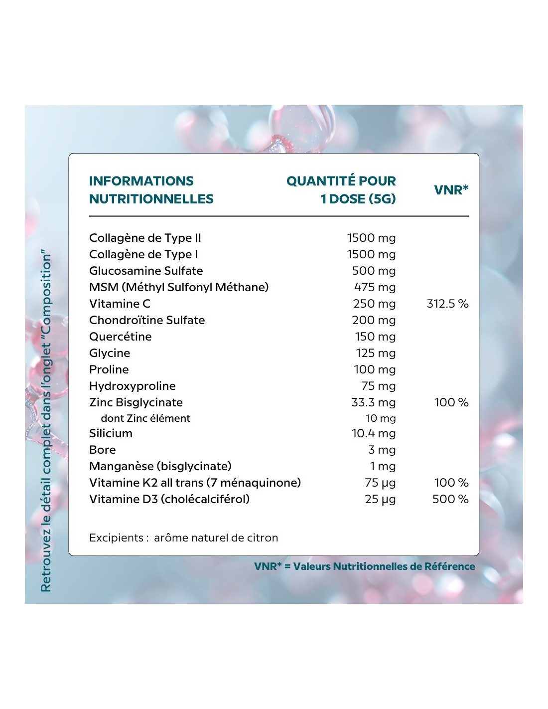 | Collagène de Type I (marin) | 1500 mg | - |