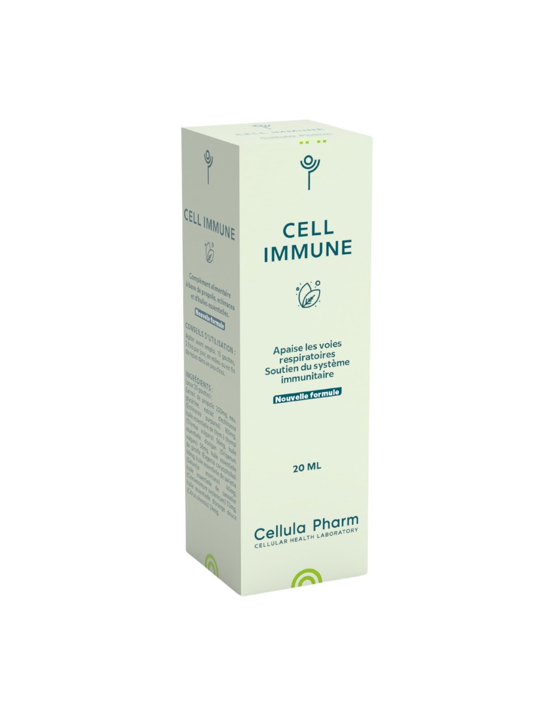 Eau, extrait de propolis 200mg, extrait d’échinacée (Echinacea purpurea) 160mg, huile essentielle de thym à thymol (Thymus vulgaris) 56mg, huile essentielle d’origan (Origanum vulgare) 56mg, huile essentielle de clou de girofle (Syzygium aromaticum) 48mg, huile essentielle de sarriette (Satureja montana) 40mg, huile essentielle de cannelier (Cinnamomum zeylanicum) 32mg, huile essentielle d’orange douce (Citrus sinensis) 24mg.