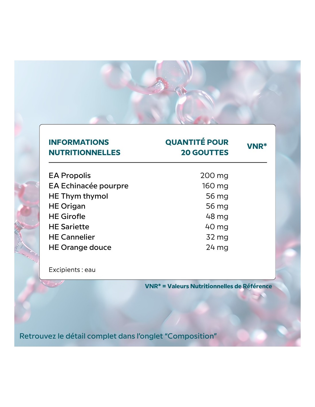 | Actifs : | 20 gouttes = 0.8 ml | VNR* |